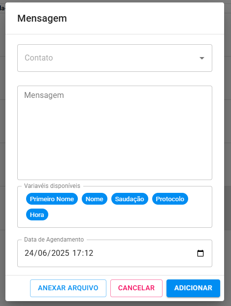 Durante o atendimento, no menu superior direito do ticket, há a opção Agendamento. Isso facilita agendar uma mensagem sem sair da tela de atendimento, otimizando o seu tempo e mantendo o foco no cliente.