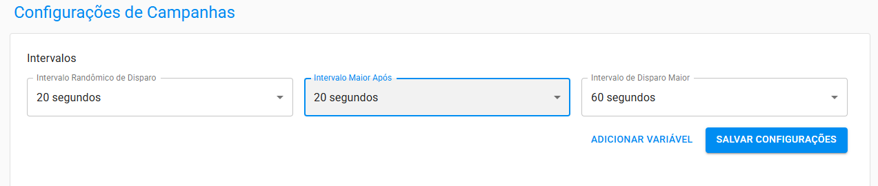 Na tela de Configurações de Campanhas, você define apenas os intervalos de tempo entre os disparos de mensagens.