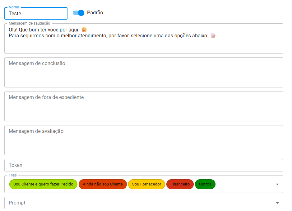 Mensagem de saudação: Texto que o cliente verá ao acessar a fila.