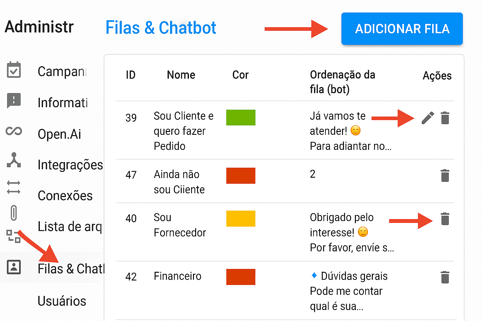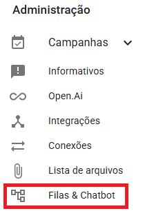 🖱 No menu lateral, clique em Administração > Filas & Chatbot